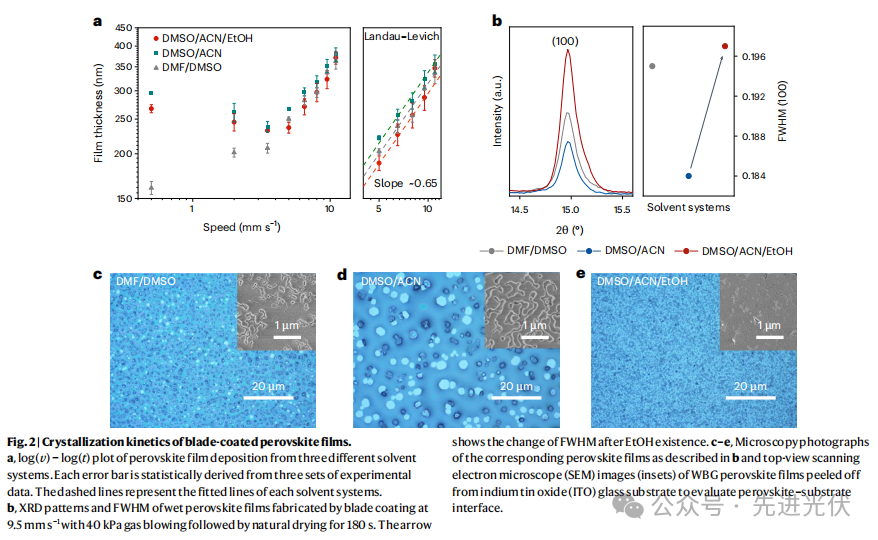 图(a)显示DMSO/ACN/EtOH系统在5-11 mm/s范围内均可形成无孔洞薄膜,而对照组存在明显工艺窗口限制。XRD半峰宽数据(b)表明乙醇添加使晶粒尺寸减小,显微镜照片(c-e)证实其形成更均匀的晶核分布,SEM(插图)显示EtOH改性后的薄膜与基底界面接触更紧密,避免了DMSO残留导致的空洞问题。这一系列数据证明EtOH通过调控DMSO-PbI₂加合物浓度,实现了结晶速率与成核密度的平衡。