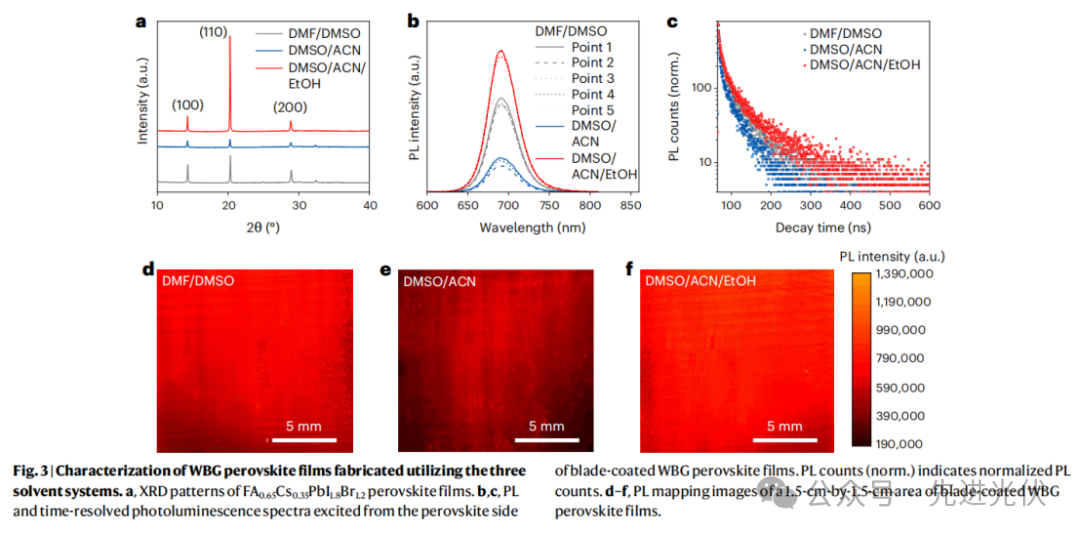 XRD图(a)谱显示绿色溶剂制备的薄膜具有更高的(110)晶向结晶度。稳态PL光谱(b)中DMSO/ACN/EtOH样品发光强度提升3倍,时间分辨PL(c)显示载流子寿命延长至158 ns,表明缺陷态密度显著降低。PL mapping图像(d-f)进一步证明乙醇改性后的薄膜在6×6 cm²范围内发光均匀性大幅改善,局域电位波动从±15 mV降至±5 mV。这些结果从光电性能角度验证了绿色溶剂系统对薄膜质量的提升效果。
