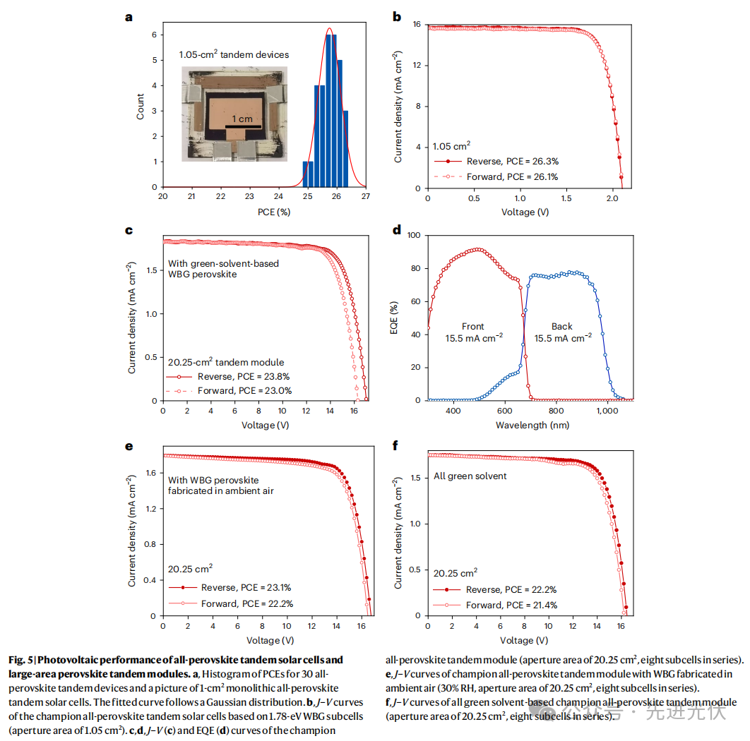 ➤ 实现高效宽带隙与全钙钛矿叠层器件:1.78 eV与1.68 eV PSCs效率分别达19.6%与21.5%;全钙钛矿叠层效率26.3%,模组(20.25 cm²)效率23.8%。