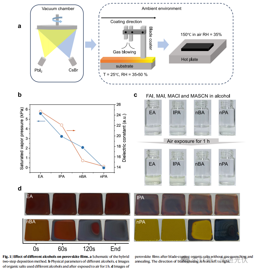 示意图(a)揭示了混合两步沉积法的工艺流程,结合蒸发和刮刀涂布技术,满足大面积制备需求。(b)通过对比乙醇(EA)、异丙醇(IPA)、正丁醇(nBA)和正戊醇(nPA)的物理参数,清晰呈现了随着碳链增长,溶剂极性和饱和蒸气压的下降规律。(c)直观展示了不同溶剂配制的有机盐溶液在空气中暴露1小时后的颜色变化:EA和IPA溶液明显变黄(I2生成),而nBA和nPA基本保持不变,证明了低极性溶剂的防潮优势。(d)展示了刮涂后未经过淬火和退火的薄膜状态,nBA和nPA因挥发慢呈现逐渐变暗,反映了溶剂挥发速率对结晶过程的调控作用。