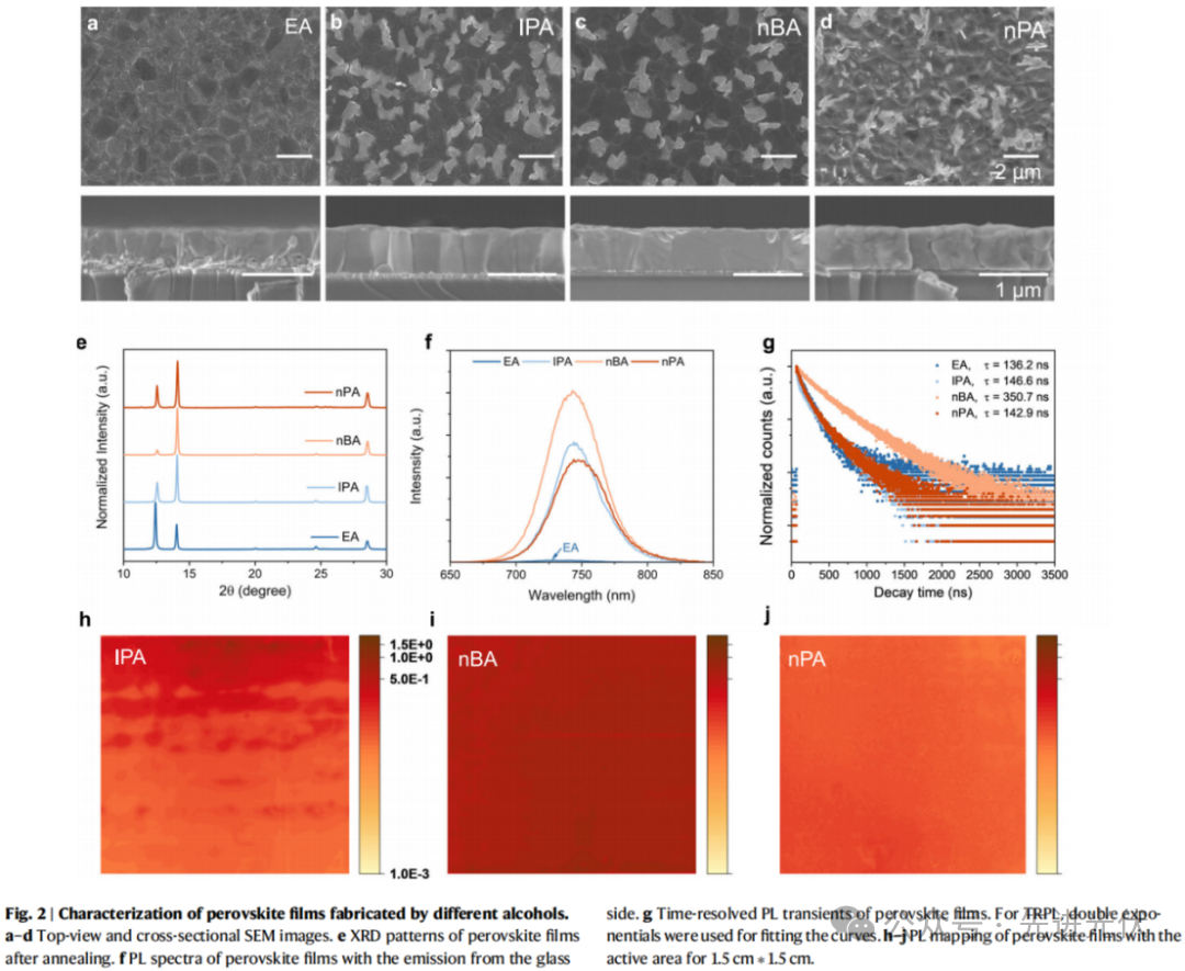 (a-d)的SEM图像清晰显示,EA薄膜存在大量未反应的PbI2,IPA薄膜在空气中退火后出现分解,nBA薄膜表面洁净、覆盖完整,而nPA因挥发过慢导致钙钛矿结构破坏。(e)XRD图谱定量证实nBA薄膜的PbI2残留信号最弱,结晶质量最佳。(f)稳态PL光谱表明nBA薄膜具有最强的荧光强度,意味着最低的缺陷密度。(g)TRPL测试显示nBA薄膜的载流子寿命最长(350.7 ns),非辐射复合得到有效抑制。(h-j)PL mapping直接证明了nBA薄膜在1.5 cm × 1.5 cm面积上的优异均匀性,为大面积制备奠定了基础。