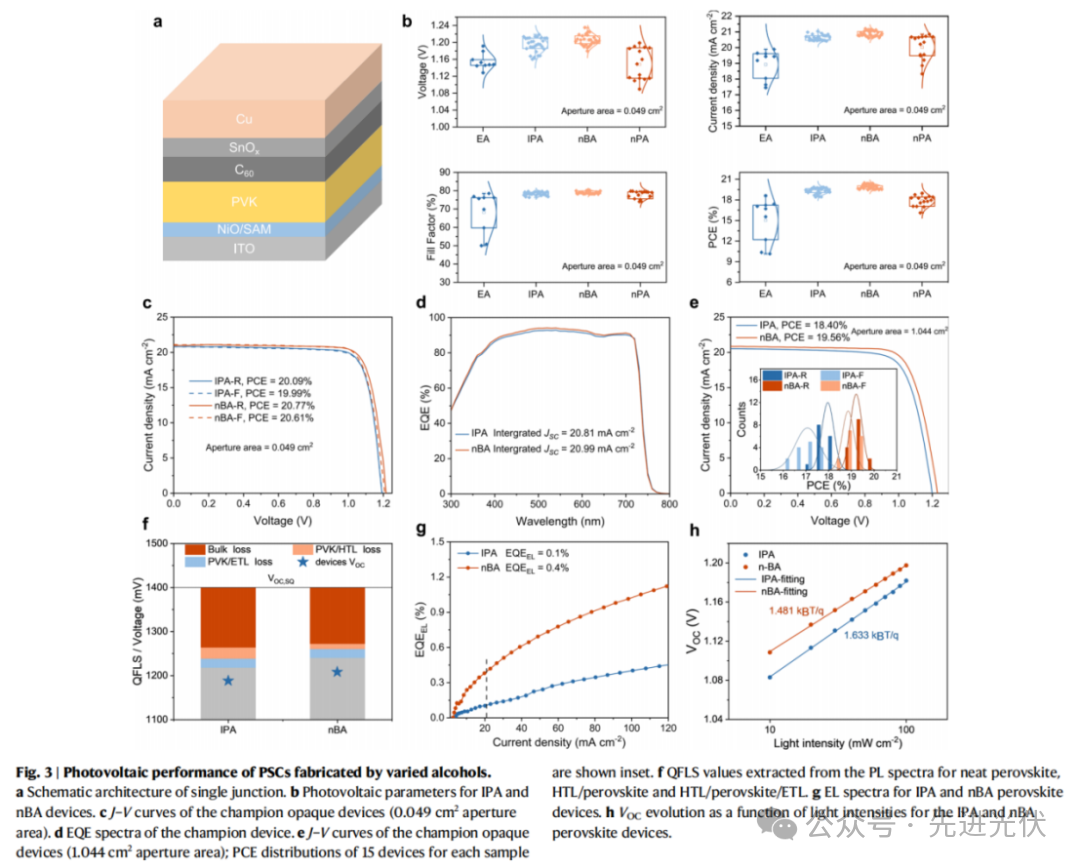 (a)展示了单结器件的结构示意图。(b)对比了IPA和nBA器件的关键参数(Voc, Jsc, FF, PCE),显示出nBA器件更优的性能和更窄的分布,重复性高。(c)冠军器件的J-V曲线显示nBA器件获得了更高的Voc和Jsc。(d)EQE光谱证实nBA器件在400-600 nm波段具有更高的响应度,与Jsc测量值吻合。(e)大面积(1.044 cm²)器件的J-V曲线及15个器件的效率分布直方图,凸显了nBA在大面积应用中的优势。(f)QFLS测量、(g)EL效率以及(h)光强依赖的Voc分析,共同从物理机制上解释了nBA器件性能提升的原因:更低的非辐射复合损失和陷阱辅助复合。