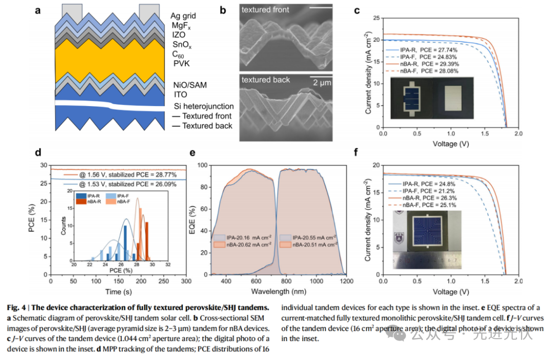 (a)钙钛矿/硅异质结(SHJ)叠层太阳能电池的结构示意图。(b)截面SEM图像证明了nBA策略能在平均尺寸为2-3 μm的工业级织构硅金字塔上实现保形覆盖,形成高质量的钙钛矿层。(c)冠军叠层器件(1.044 cm²)的J-V曲线达到了29.39%的效率(Voc=1.83 V, Jsc=20.45 mA/cm², FF=78.63%),插图为实物照片。(d)MPP跟踪测试证明了器件的运行稳定性,插图为16个器件的效率分布,一致性良好。(e)EQE光谱显示前后子电池的电流匹配良好(~20.5 mA/cm²),且在不同位置测量结果一致,反映了薄膜的卓越均匀性。(f)最终,将器件面积放大到16 cm²,仍实现了26.3%的高效率,并展示了slot-die涂布技术制备的25.9%效率器件,充分验证了该溶剂工程策略在大规模生产中的巨大潜力。