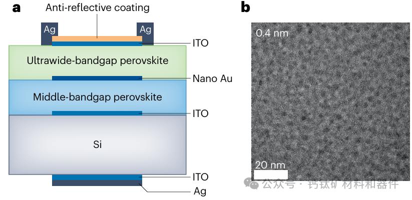 a、钙钛矿/钙钛矿/硅三结叠层电池的简化器件结构。ITO-氧化铟锡。b、0.4 nm“超薄”Au界面层的透射电子显微镜图像(图转载自参考文献https://doi.org/10.1038/s41565-025-02015-x) Springer Nature Ltd.消息来源: Nature Nanotechnology https://doi.org/10.1038/s41565-025-02051-7