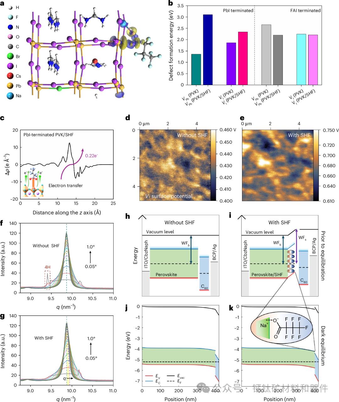 针对这一挑战,李桂香教授团队长期聚焦新型光伏器件界面物理机制与稳定性研究,并在本次工作中创新性地构建了“光活性层表面—接触界面—电子传输层”一体化调控体系。该设计实现了三重提升:显著提高钙钛矿表面的缺陷形成能,从根源上增强了材料结构稳定性;形成界面偶极矩优化能级结构,大幅提升了电荷抽取与传输效率;促进电子传输材料形成致密均匀膜层,有效抑制了离子迁移与电极腐蚀。