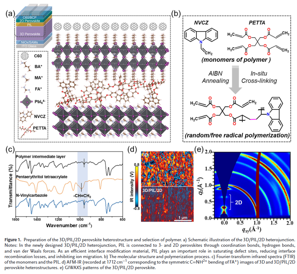 - 创新性聚合物桥接层:设计了一种新型高交联聚合物中间层(PIL),巧妙地插入3D与2D钙钛矿之间,同时实现了缺陷钝化、能级梯度调控与离子迁移抑制的三重功能。