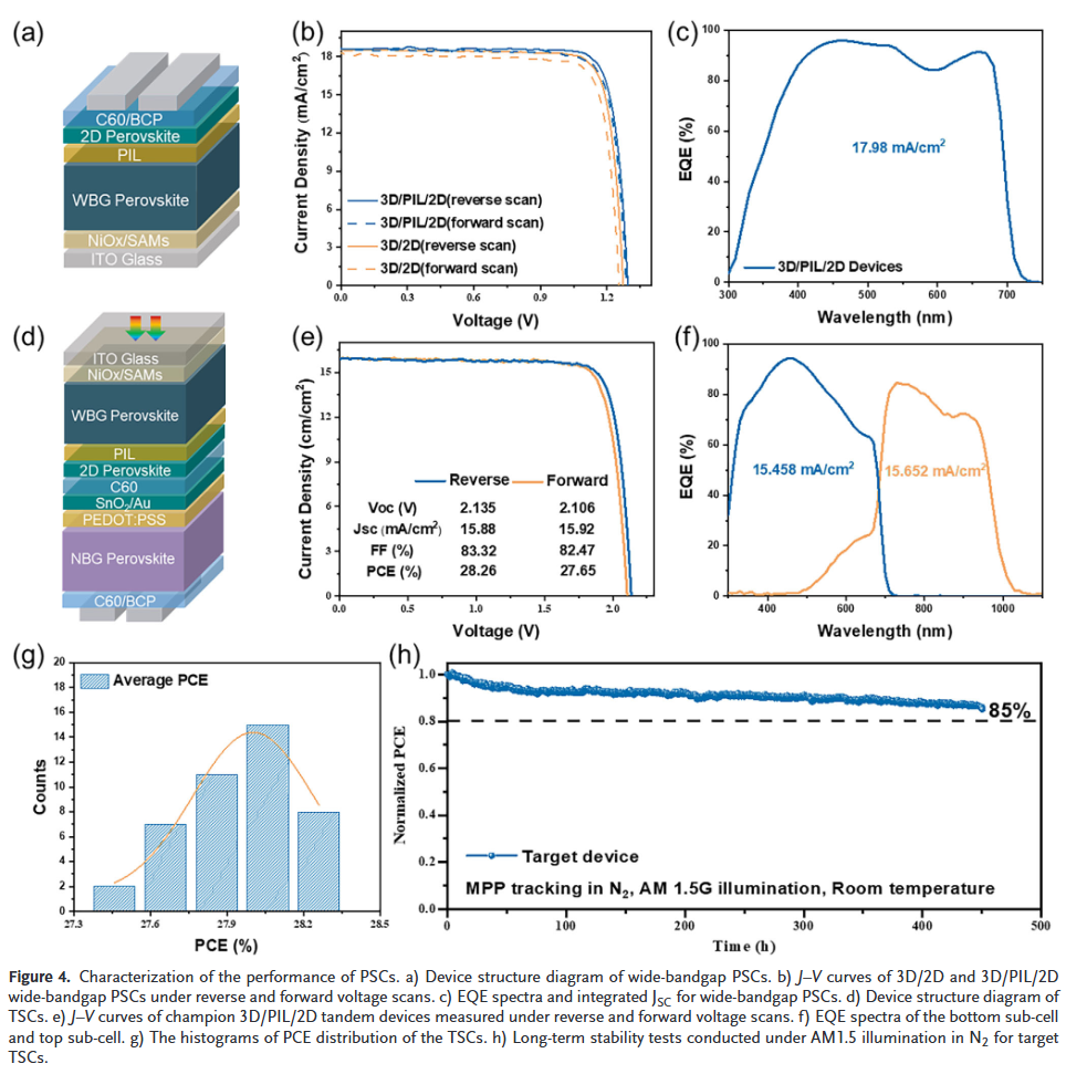 - 卓越效率与稳定性:基于此策略,成功制备出效率高达28.26%(认证效率27.29%)的全钙钛矿叠层电池,并展现出2.151 V的高开路电压和优异的热稳定性,为高性能叠层器件的开发树立了新标杆。
