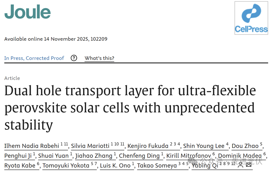 Rabehi I N, Mariotti S, Fukuda K, et al. Dual hole transport layer for ultra-flexible perovskite solar cells with unprecedented stability. Joule (2025).