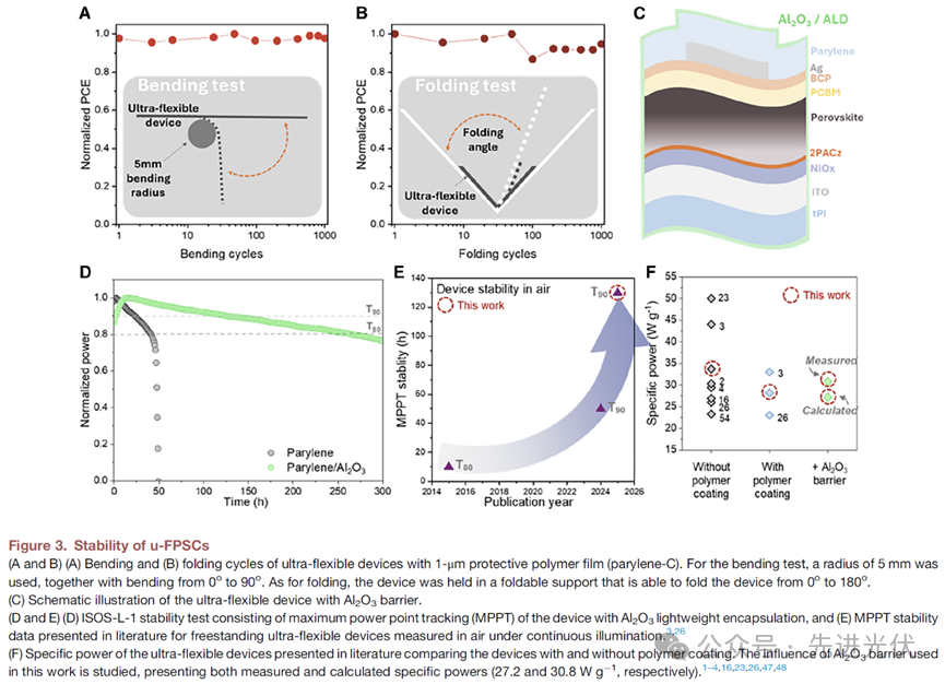 3.本研究系统评估了超柔性钙钛矿太阳能电池的机械与环境稳定性。器件在经历1000次弯曲和折叠测试后,光电转换效率分别保持初始值的98%和95%,其卓越机械稳定性源于自组装单层与氧化物基底间的共价键合作用。为解决空气中快速降解的问题(T80<50小时),创新性地在派瑞林涂层两侧沉积15纳米Al₂O₃阻挡层,该设计使器件在空气中达到T90=130小时、T80=260小时的突破性稳定性,且不影响其折叠稳定性(千次折叠后效率保持96.1%)。研究还发现3微米超薄基底能有效分散应力,避免Al₂O₃层开裂。比功率测试显示,带封装器件的比功率为27.2 W g⁻¹,仅比未封装状态降低1.5%,证实超薄屏障在显著提升环境稳定性的同时,成功保持了器件的轻质特性与机械柔韧性,为超柔性光电器件的实际应用奠定了坚实基础。