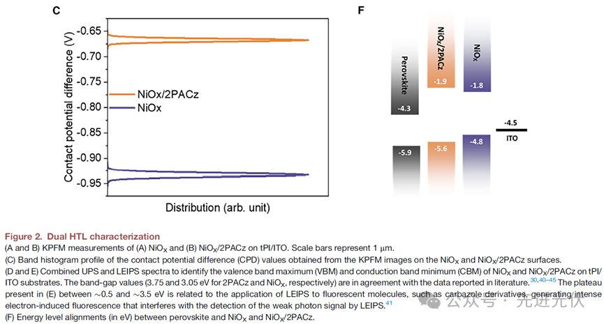 1.界面工程:采用NiOX/2PACz双分子空穴传输层,通过能带调控与界面偶极作用,实现载流子的高效提取与传输。