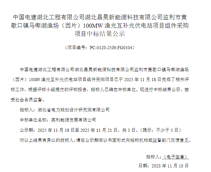 11月18日,中国电建湖北工程有限公司湖北昌昊新能源科技有限公司监利市黄歇口镇马嘶湖渔场(西片)100MW渔光互补光伏电站项目组件采购项目成交结果公示,中标企业为英利能源发展有限公司。