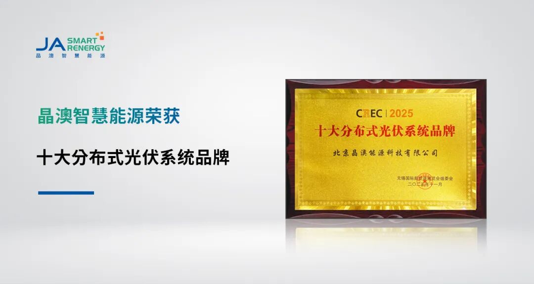 近日,以“能碳未来·绿动全球”为主题的第十七届中国(无锡)国际新能源大会暨展览会(CREC 2025)盛大启幕。本届展会以“能碳未来·绿动全球”为主题,全面展示新能源领域的新产品、新技术、新应用。在同期举办的光伏品牌评选中,晶澳智慧能源凭借卓越的零碳园区解决方案与广泛的市场认可,成功斩获“十大分布式光伏系统品牌”奖项。