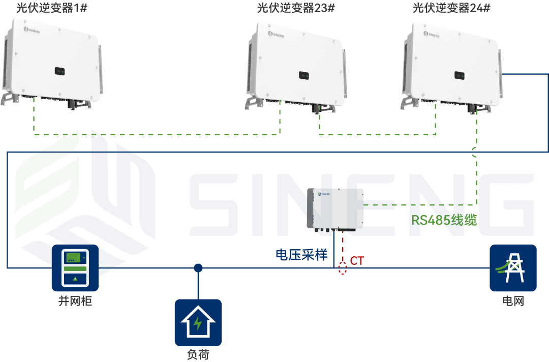 原有配置的数据采集器集成防逆流控制算法,作为控制单元;多台逆变器之间手拉手组网,共同作为执行单元,电表作为上网功率的检测单元。当电表检测到有上网功率时,数据采集器立即命令逆变器调整功率。方案最多支持24台逆变器并网场景,可有效保证光伏发电全额自发自用。