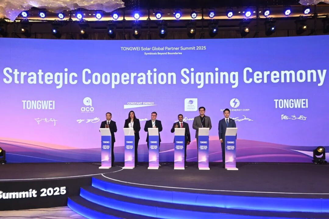 大会期间,通威与Sungrid Energy Corp.、Arab Consulting Office、Sun City To Import Renewable Solar Energy Systems、Constant Energy Services (Thailand) Co., Ltd.分别签署了战略合作协议,通威股份董事宋东升、通威股份光伏商务部组件营销海外负责人陈方舟、Sungrid Energy Corp.首席运营官秦晓东、Arab Consulting Office首席执行官Aya Zanaty、Constant Energy Services (Thailand) Co., Ltd.工程与战略采购区域主管Tommy Schneider、Sun City To Import Renewable Solar Energy Systems首席执行官Ahmed Qatran出席并代表签约。