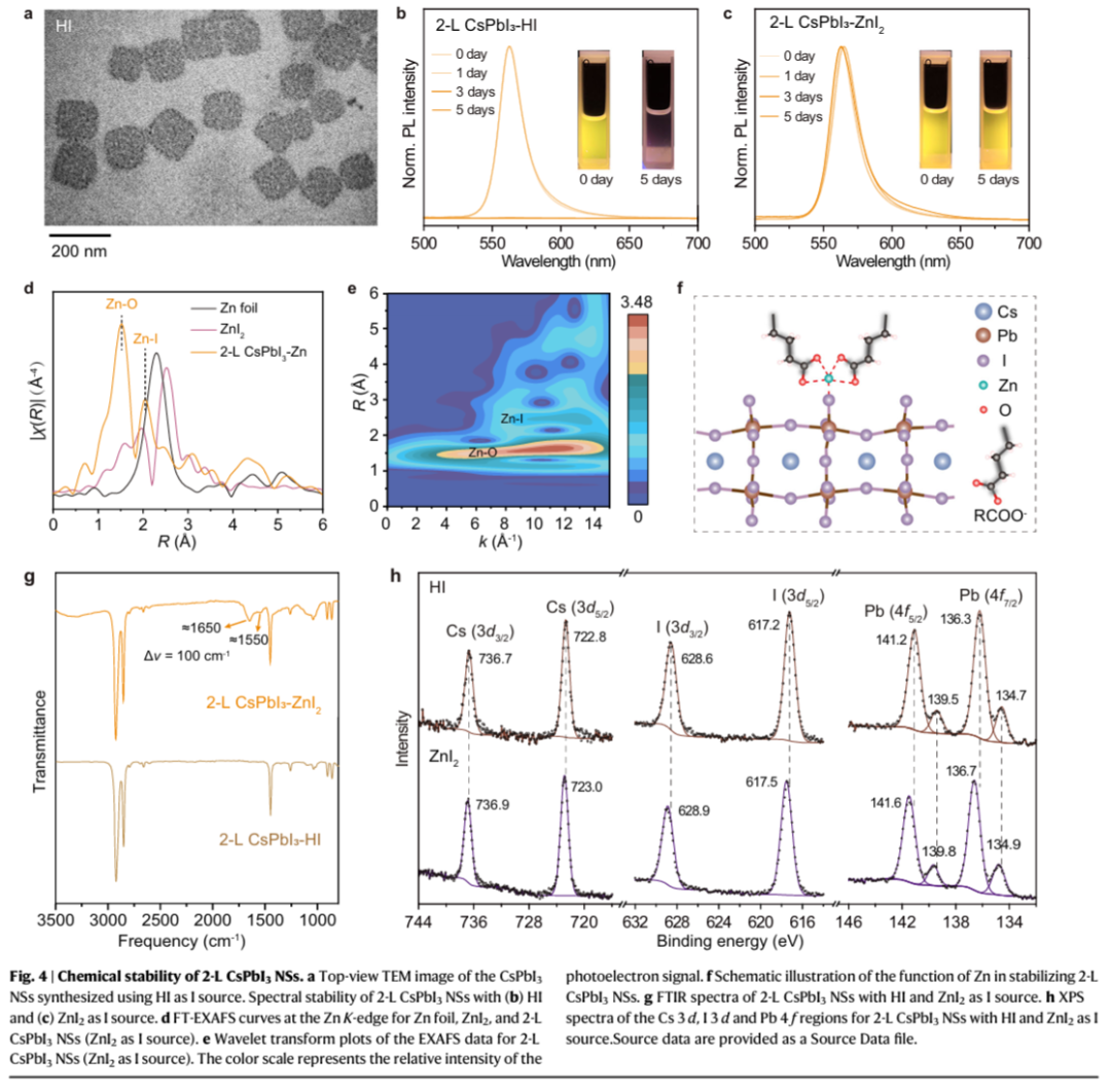 - 表面钝化提升稳定性与发光性能:引入ZnI₂作为碘源不仅维持反应平衡,其表面Zn²⁺离子通过双齿配位与碘键合,显著提升纳米片的光致发光量子产率(37.04%)及长期稳定性。