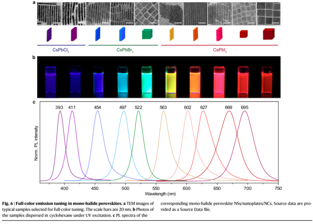 - 通用性强,实现全彩发射调控:该策略可拓展至CsPbBr₃与CsPbCl₃体系,合成不同层数的纳米片与纳米晶,覆盖紫光至红光波段,为单一卤化物钙钛矿实现全彩发射提供可行路径。