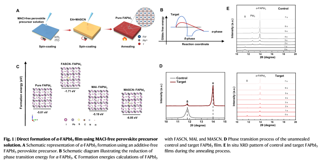 - 首创无MA⁺残留的α-FAPbI₃制备策略:提出α相辅助反溶剂法,利用不含MACI的前驱体与MASCN反溶剂添加剂,成功制备高质量、无MA⁺残留的纯相α-FAPbI₃薄膜,从源头上避免MA⁺挥发导致的热/光不稳定性。