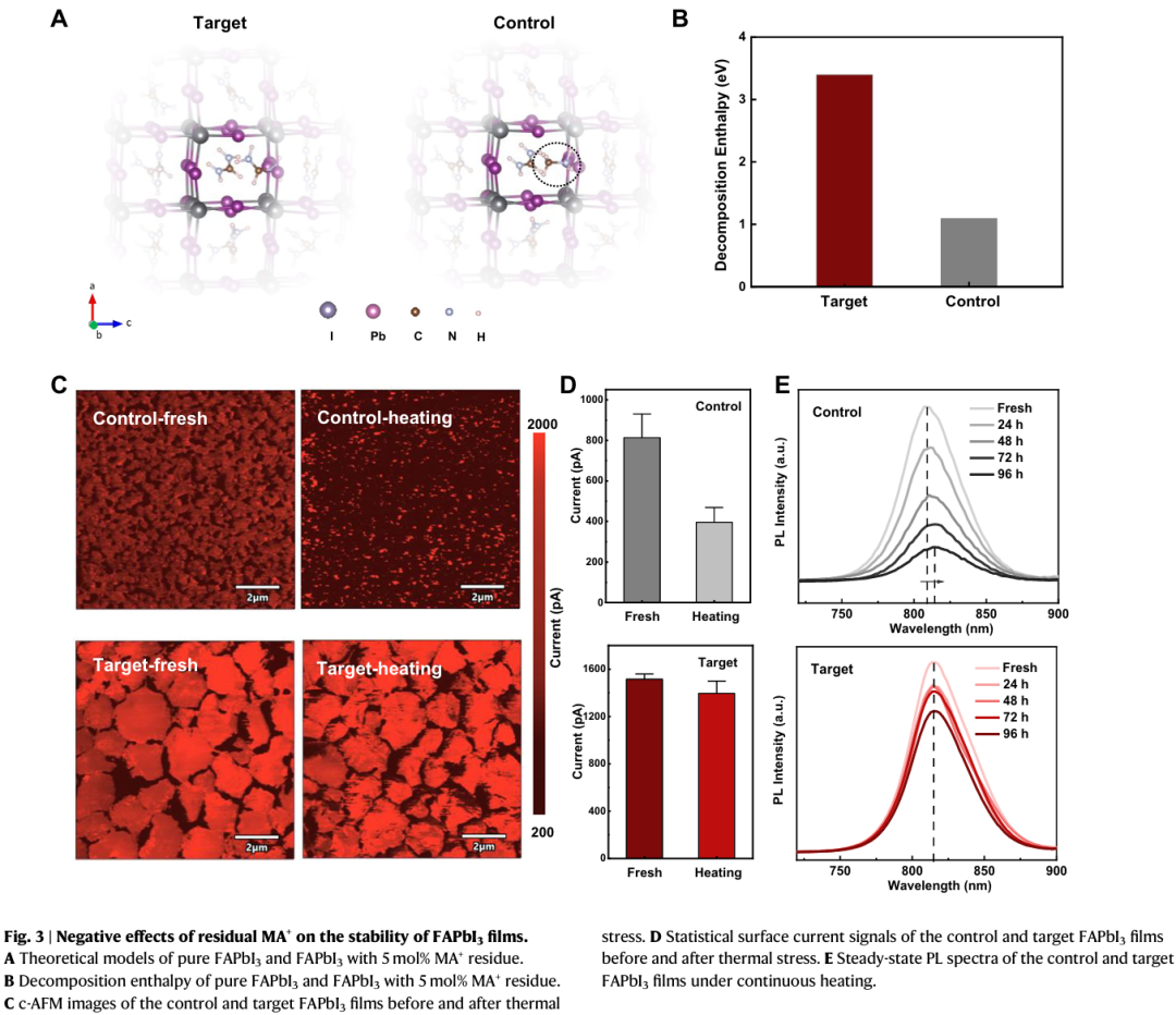 - 揭示MA⁺残留对稳定性的内在影响机制:通过DFT计算与多种表征手段,明确MA⁺残留会降低FAPbI₃分解焓,诱发PbI₂生成与Ag离子迁移,而目标薄膜则表现出优异的相纯性与界面完整性。