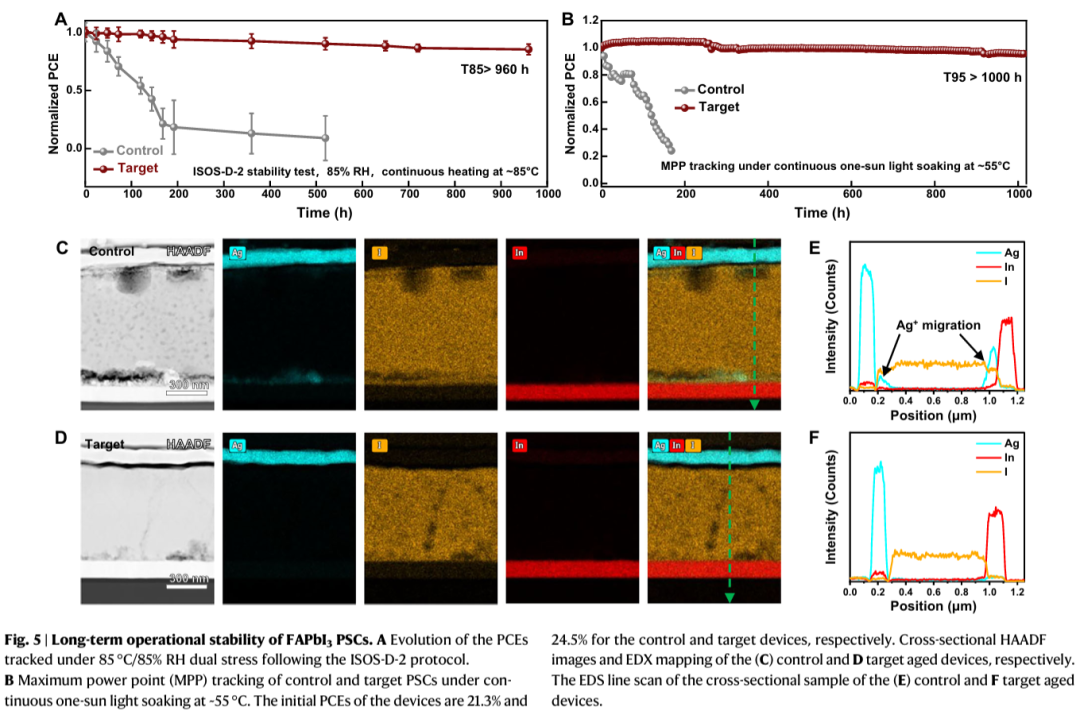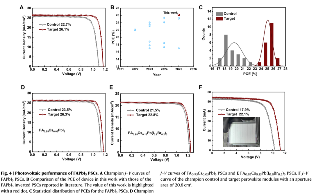 - 实现26.1%高效率与优异稳定性兼具:优化后的倒置结构电池效率达26.1%,认证效率26.08%,同时在55°C持续光照下运行1000小时后仍保持95%以上初始效率,显著优于含MA⁺器件的快速衰减。