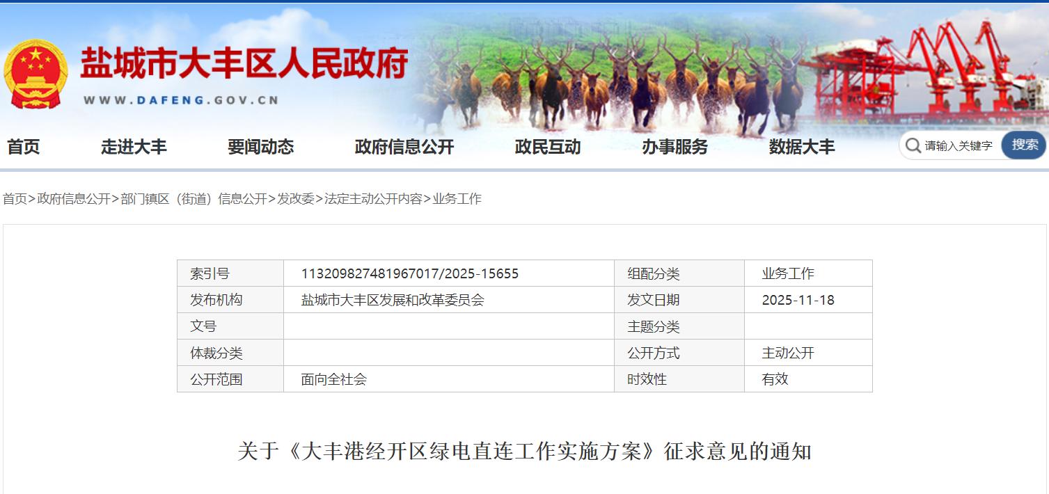 11月18日,江苏盐城市大丰区发展和改革委员会发布关于《大丰港经开区绿电直连工作实施方案》征求意见的通知。