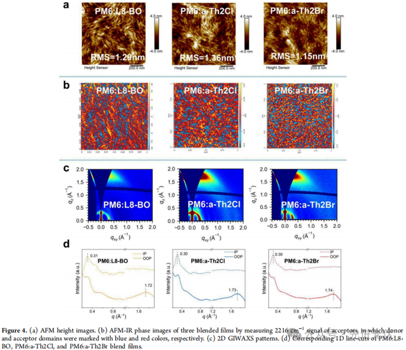 形貌与堆积:AFM-IR与GIWAXS显示,a-Th2Br共混膜具有更清晰的给体/受体相分离、更小的纤维尺寸(14.7 nm)与更高的结晶相干长度(CCL=31.23 Å),有利于激子分离与电荷传输。