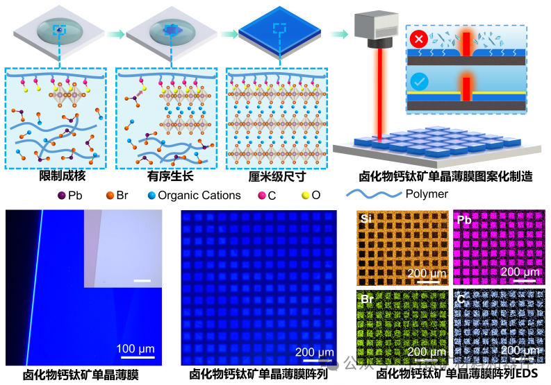 图1 卤化物钙钛矿单晶薄膜的生长机理及阵列化示意图