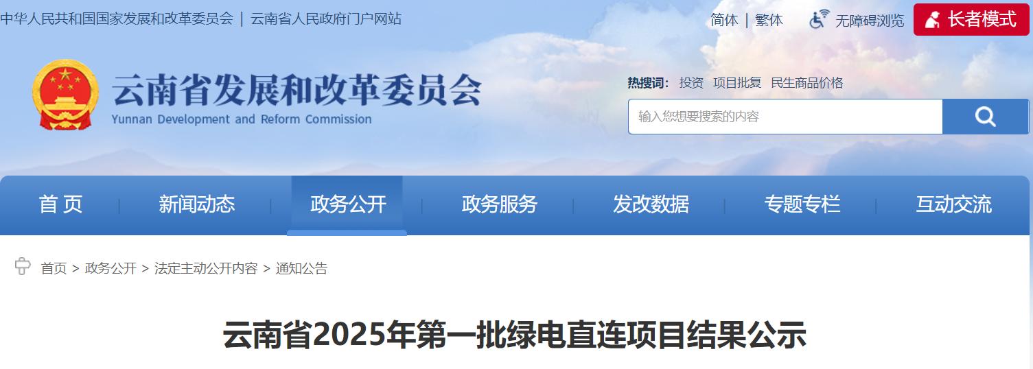 按照《国家发展改革委 国家能源局关于有序推动绿电直连发展有关事项的通知》(发改能源〔2025〕650号)、《云南省发展和改革委员会 云南省工业和信息化厅 云南省能源局关于〈云南省推动绿电直连建设实施方案〉的通知》(云发改能源〔2025〕577号)的有关规定,省发展改革委会同省工业和信息化厅、省能源局组织各州(市)开展绿电直连项目申报,经专家评审、听取相关部门和电网企业意见后,拟确定4个符合绿电直连条件的项目进入2025年第一批绿电直连项目清单。现公示如下: