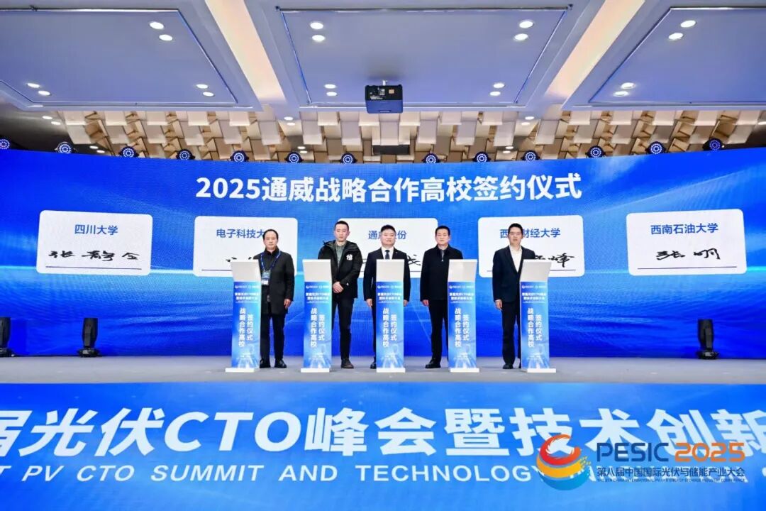 在战略合作高校签约仪式环节,通威股份有限公司与西南财经大学、西南石油大学、四川大学材料科学与工程学院、电子科技大学光电科学与工程学院分别签署战略合作框架协议,重点围绕人才培养与科研协同两大方向深化校企、院企合作。在人才方面,推进建立校企协同育人机制,通过共建实践基地、定向输送等方式培养契合产业需求的高素质人才;在科研方面,将联合组建协同创新平台,聚焦“双碳”目标开展关键技术攻关与成果转化。通过强强联合,整合高校科研优势与企业产业资源,为行业创新发展构建强劲“智力引擎”。