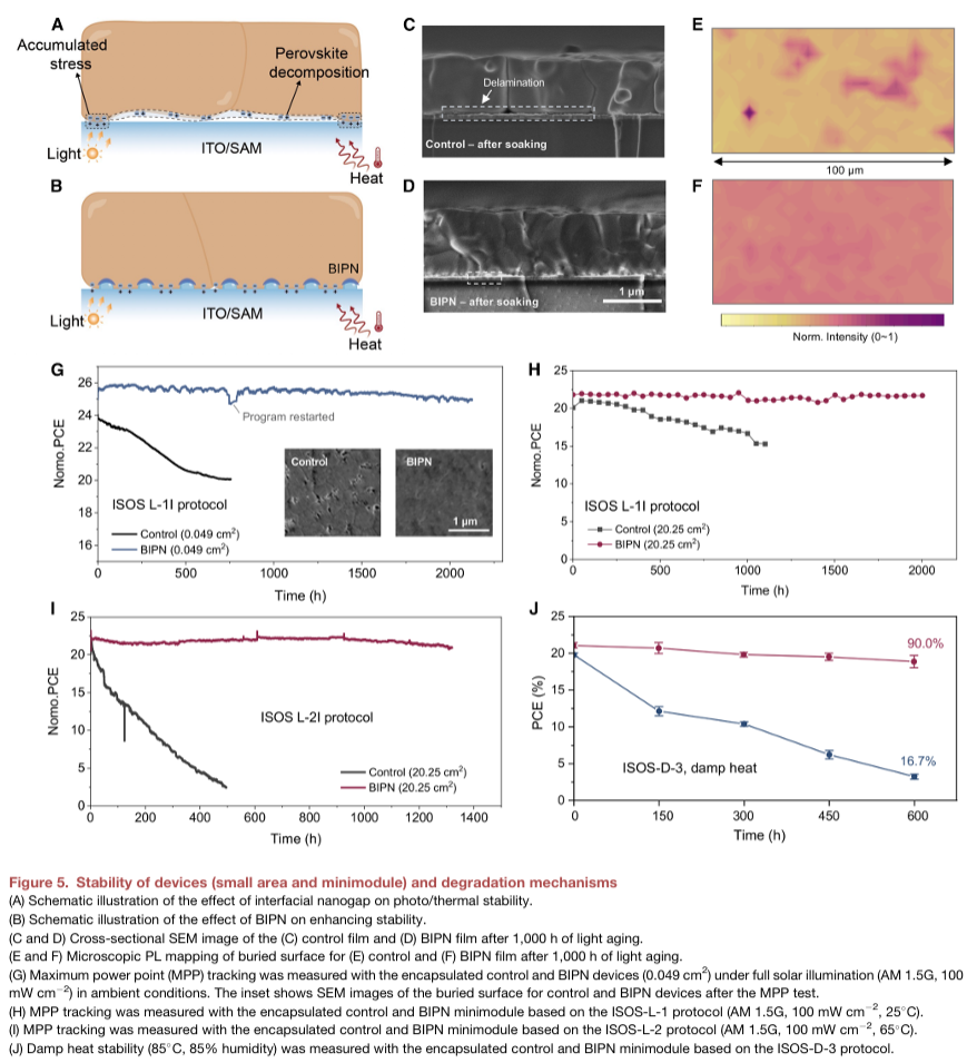 该研究揭示了可扩展钙钛矿光电器件中埋入界面失效机制,并提供了一条兼具机械强化与化学稳定的产业化路径。