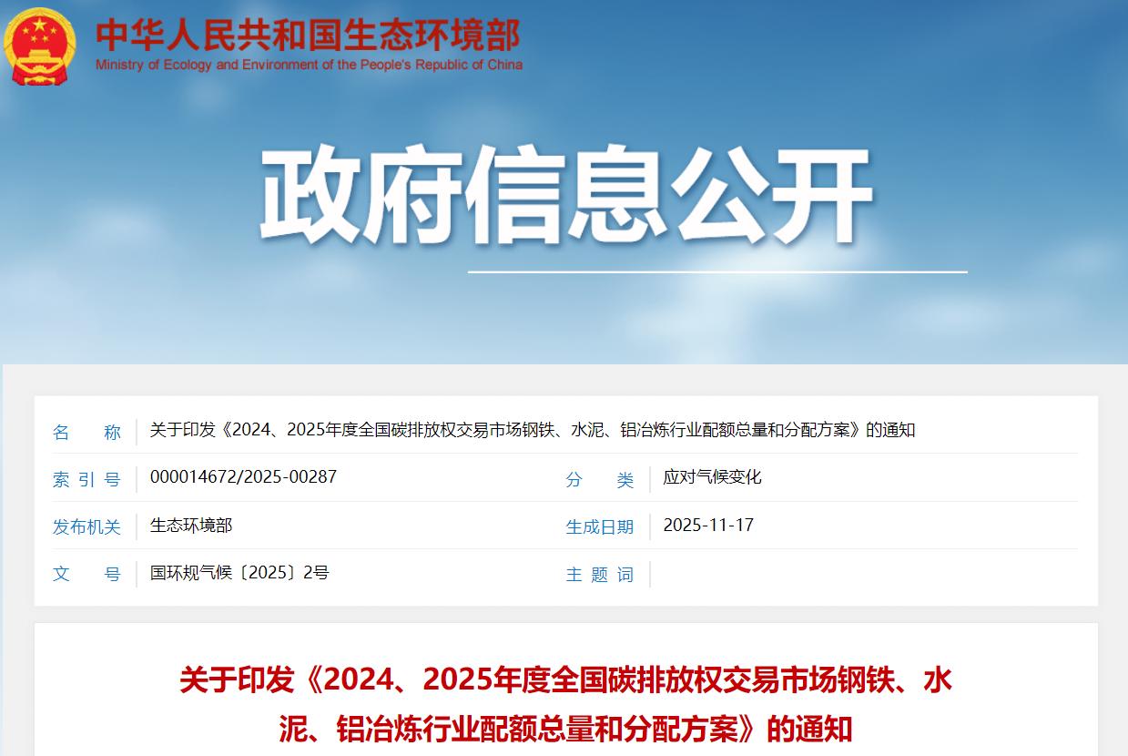 关于印发《2024、2025年度全国碳排放权交易市场钢铁、水泥、铝冶炼行业配额总量和分配方案》的通知