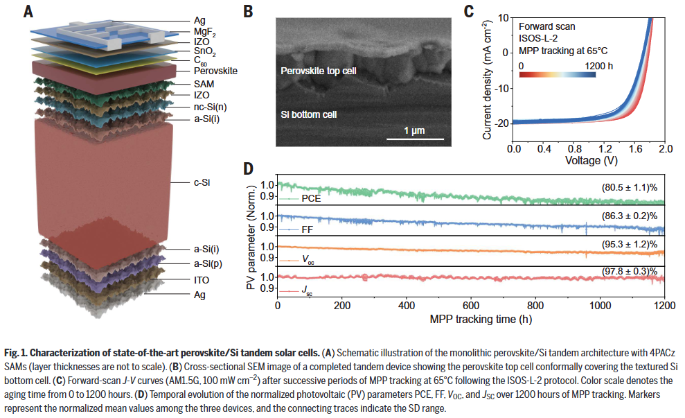 采用该策略的1平方厘米钙钛矿/硅叠层太阳能电池实现了超过34%的功率转换效率(认证效率33.61%),并且三个独立器件在65°C、AM 1.5G光照下、经过约1200小时的最大功率点跟踪运行后,仍能保持其初始性能的96.2 ± 1.7%。