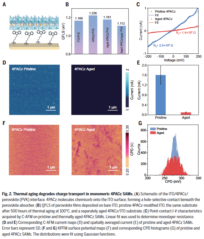 - 揭示关键降解机制:首次明确指出钙钛矿/硅叠层电池性能衰减的主要原因是空穴选择性分子接触层(SAMs)的热致无序化导致的填充因子(FF)下降,而非传统认为的钙钛矿体相降解。