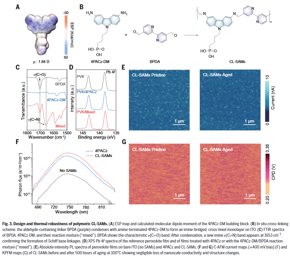 - 创新性交联策略:设计并利用希夫碱反应,在界面原位构建共价交联的分子接触层(CL-SAMs),显著增强了界面层的热稳定性和电荷传输能力。