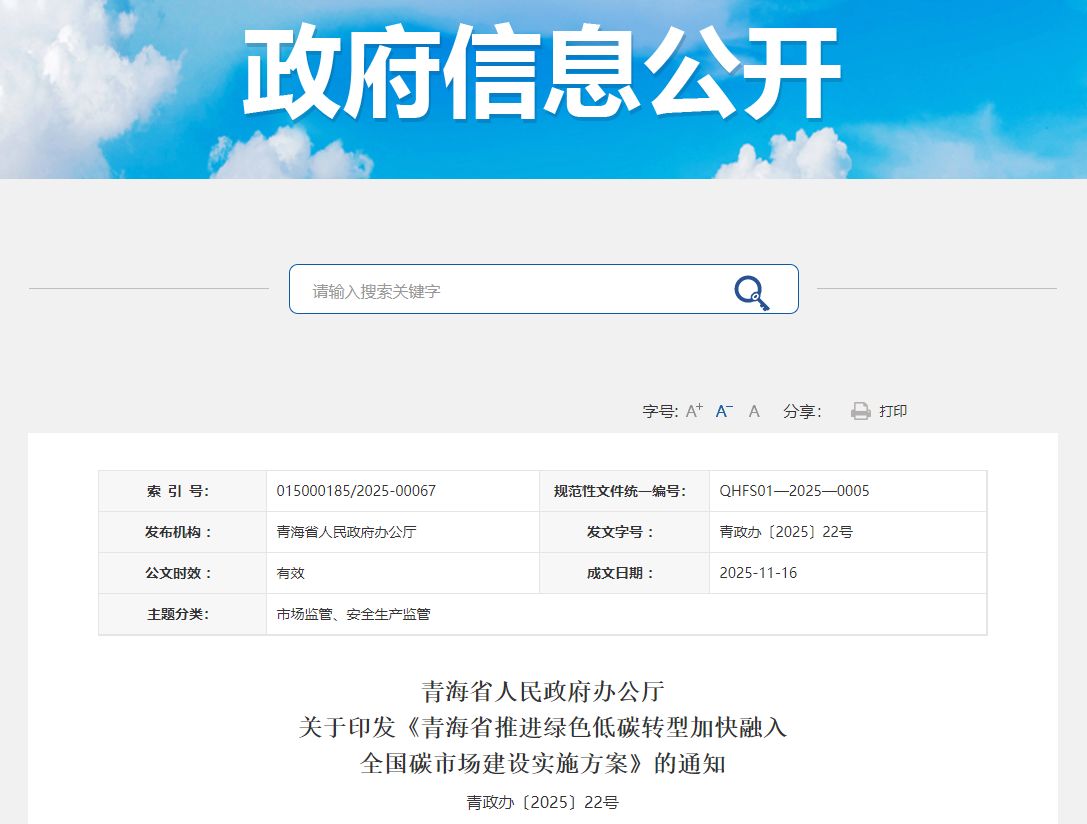 《青海省推进绿色低碳转型加快融入全国碳市场建设实施方案》已经省政府同意,现印发给你们,请认真组织实施。