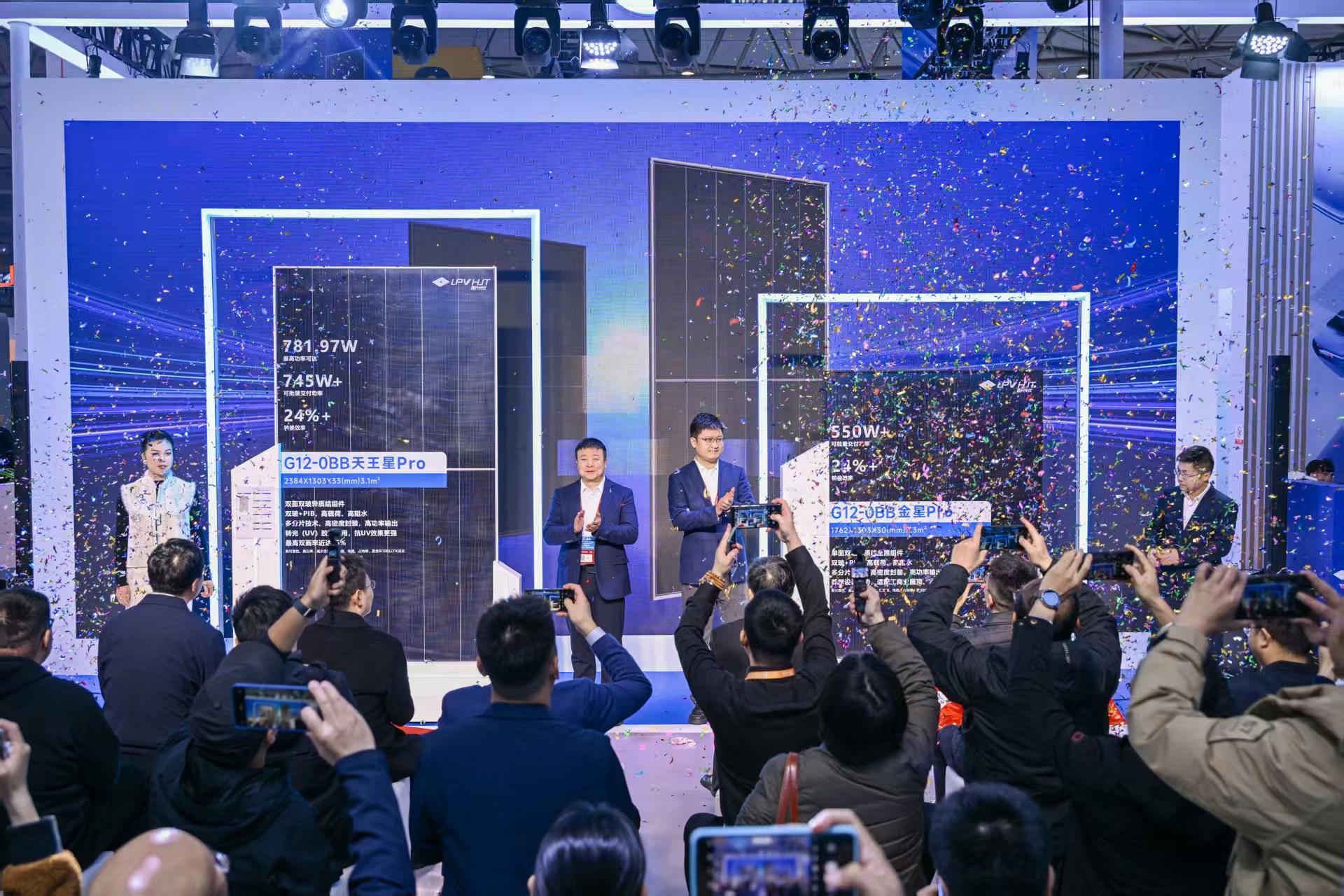 展会现场的最惊艳的莫过于19日发布的琏升光伏G12-0BB天王星PRO与金星PRO两款高效异质结组件的首次登台,作为琏升光伏顶尖研发团队创新成果,其中天王星PRO这款组件为G12-0BB版型双面双玻异质结组件,适应于大型地面电站和工商业屋顶应用场景,最高双面率近95%,可批量交付功率745W+,转换效率高达24%+;金星PRO这款组件为G12-0BB版型单面双玻异质结全黑组件,适用于工商业屋顶、高端住宅、文旅项目等应用场景,可批量交付功率550W+,转换效率高达24%+。两款组件都采用多分片技术、高密度封装,转光(UV)胶膜应用,同时具有高载荷、高阻水特性,抗UV效果更强,高功率输出、高可靠性等特点,有效减少支架、汇流箱、电缆和占地面积等成本支出,具有更优BOS和LCOE成本,在行业处于领先地位。除组件外,琏升光伏G12-0BB高效异质结电池片以及光伏瓦片也悉数亮相,为行业提供了高功率和高转换效率N型产品的优秀示范。