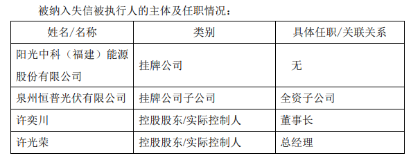 11月24日,阳光中科(福建)能源股份有限公司公告称,公司、全资子公司、实际控制人、总经理被纳入失信被执行人。