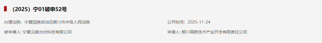 11月24日,据全国企业破产重整案件信息网披露,宁夏云皓光伏科技有限公司被申请破产,申请人银川高新技术产业开发有限责任公司。