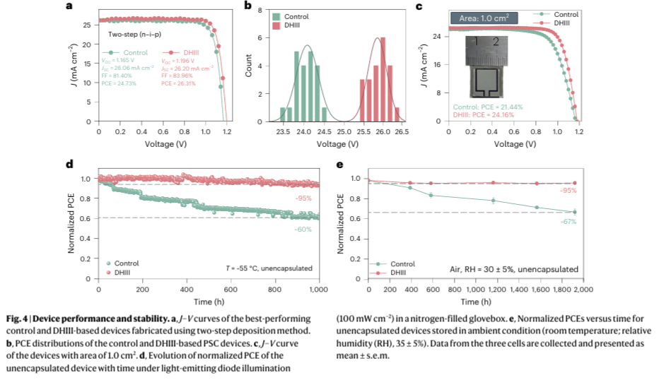 - 高效率与高稳定性兼备:n-i-p型器件效率突破26.31%,大面积器件(1.0 cm²)效率达24.16%,并在未封装条件下实现千小时光照下95%的效能保持率。