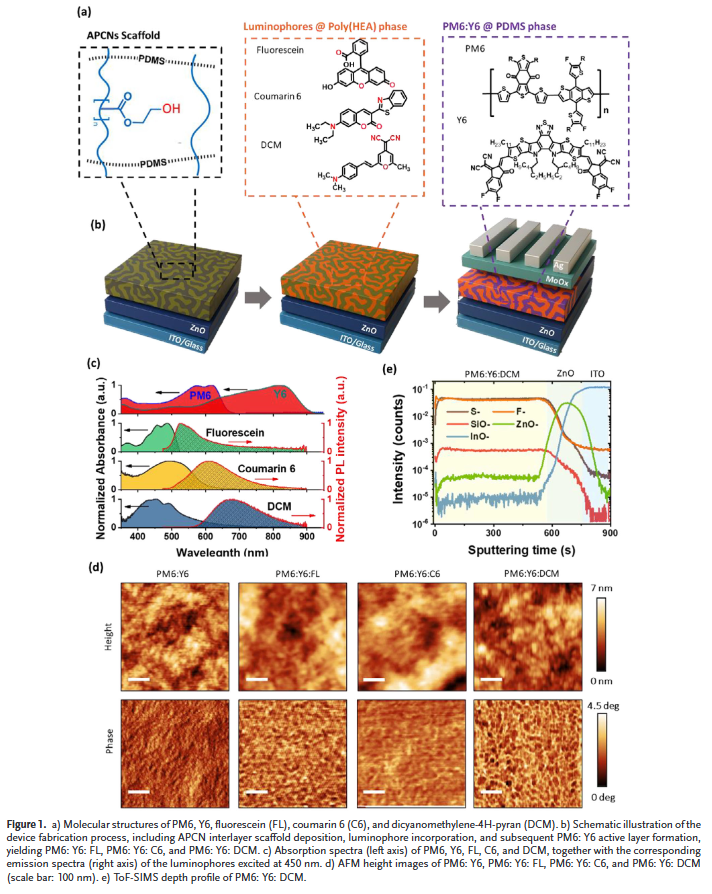 - 创新性引入APCNs作为多功能支架:利用其纳米相分离结构,成功将亲水性下转换发光团与疏水性PM6:Y6体异质结在空间上隔离,解决了材料不相容和能级不匹配问题。