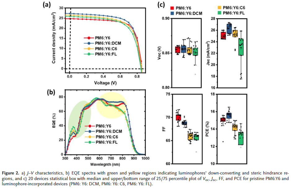 - 实现高效下转换与分子堆叠调控双重功能:DCM发光团不仅通过能量转移将紫外-蓝光转换为BHJ可吸收的光子,提升光电流,其平面分子结构还增强了Y6受体的π-π堆叠,改善电荷传输。