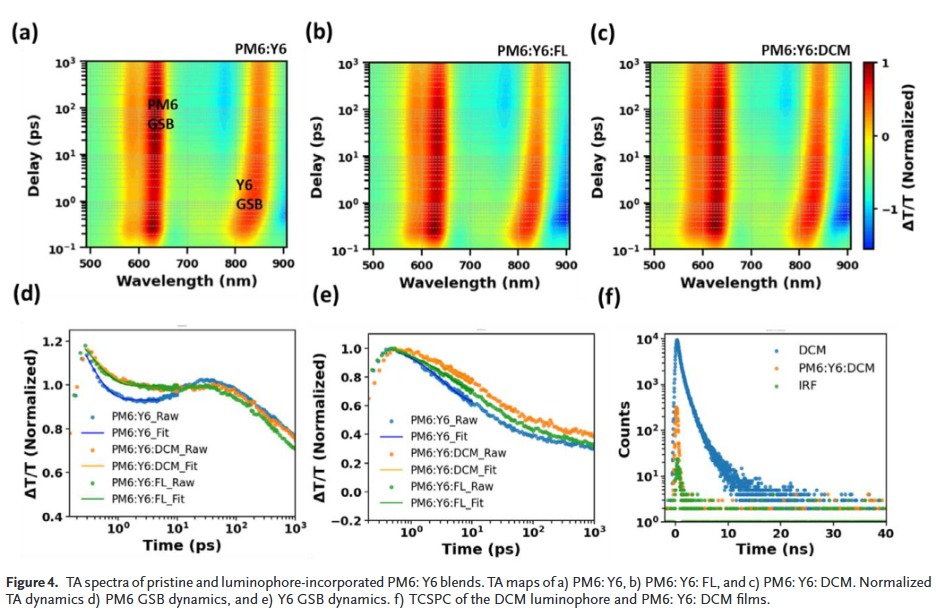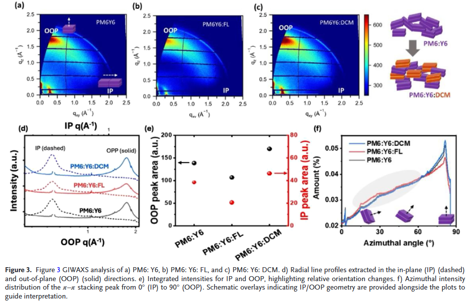本文成均馆大学Bo Ram Lee和剑桥大学Samuel D. Stranks等人将其应用拓展至有机光伏(OPVs)活性层中,实现了与传统OPV结构不兼容的下转换发光团的引入。APCN支架将亲水发光团限制在羟基丙烯酸酯域中,而疏水的PM6:Y6体异质结(BHJ)则位于聚二甲基硅氧烷域中。所选发光团具有选择性相亲和性及与BHJ互补的吸收特性。掺入二氰亚甲基-4H-吡喃(DCM)发光团的器件表现出增强的光电流,短路电流从25.7 mA cm⁻²提高至27.3 mA cm⁻²,同时保持0.86 V的开路电压。瞬态吸收光谱显示PM6和Y6的基态漂白延迟,与从发光团到BHJ的有效能量转移导致的激子补充一致。掠入射广角X射线散射表明,发光团的分子平面性和二面角通过范德华相互作用影响BHJ的堆叠,进而影响电荷传输。