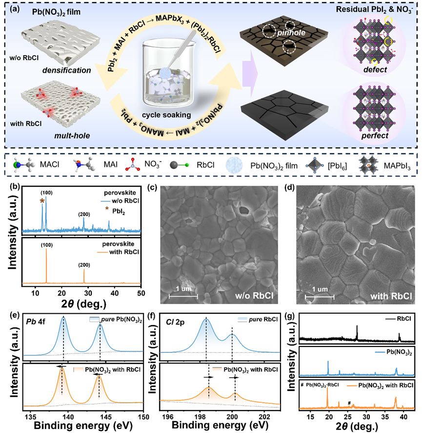 鉴于此,2025年11月20日,暨南大学陈科&谢伟广携手北京航空航天大学罗德映、中国科学技术大学胡芹共同提出一种基于Pb(NO3)2水溶液的中间相结晶调控策略有效地实现了水相铅盐Pb(NO3)2的均匀沉积并实现后体铅盐的高效管理。研究团队向Pb(NO3)2水溶液中掺杂RbCl以获得带有中间相Pb(NO3)2·RbCl的Pb(NO3)2薄膜,这种中间相有利于在Pb(NO3)2转化为PbI2后打开八面体结构,完成A位大阳离子的插入,并调控钙钛矿的晶体生长。此外,预埋入晶格的RbCl还可以将薄膜中残余的PbI2固定为非活性的(PbI2)2RbCl,从而抑制薄膜中过量的PbI2引起的离子迁移。