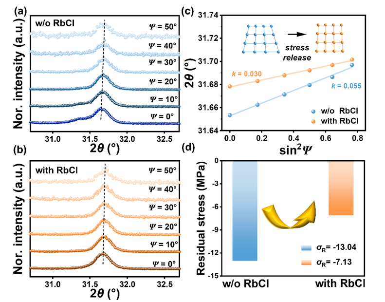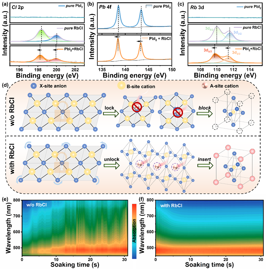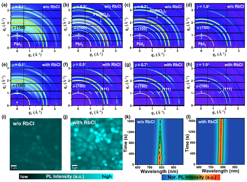 2、Pb(NO3)2与RbCl形成中间相使得能够自发调节钙钛矿结晶,从而显著提高膜质量。该中间相还可以在Pb(NO3)2向PbI2的转变过程中与过量PbI2反应,并将其转化为非活性的中间相(PbI2)2RbCl,增强稳定钙钛矿的长期稳定性。