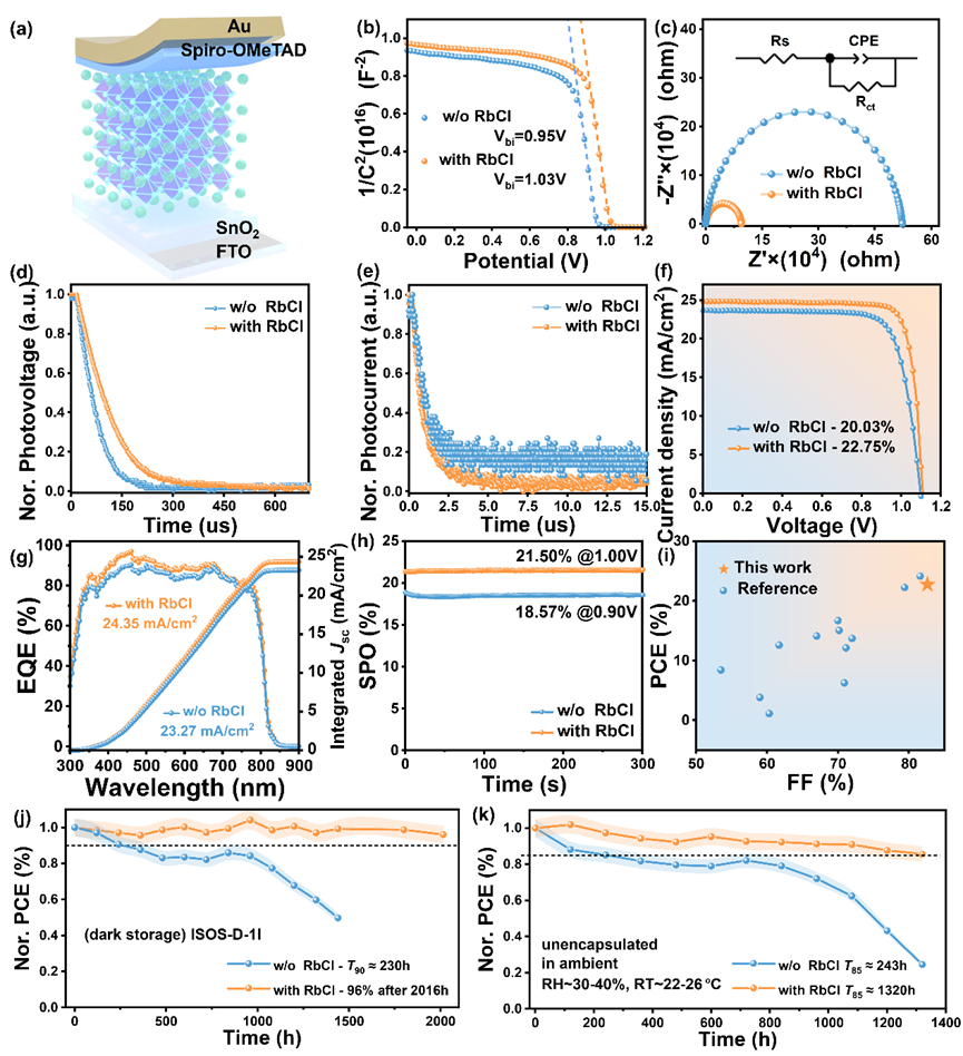 最后,掺杂RbCl的Pb(NO3)2水溶液制备出的PSCs稳定性大幅提升,并获得了22.75%的光电转化效率和82.62%的填充因子,这是所有利用水溶液Pb(NO3)2前体制备PSCs中最高的FF。