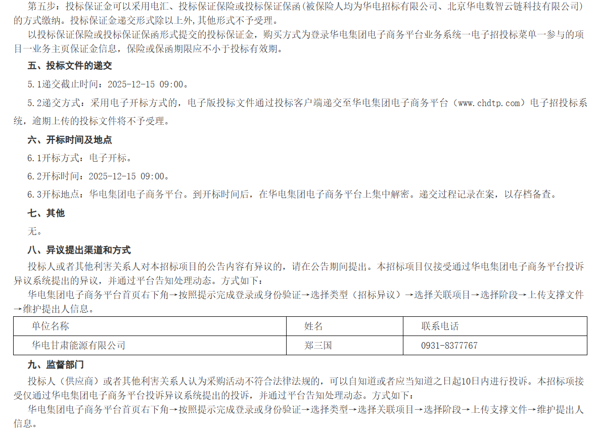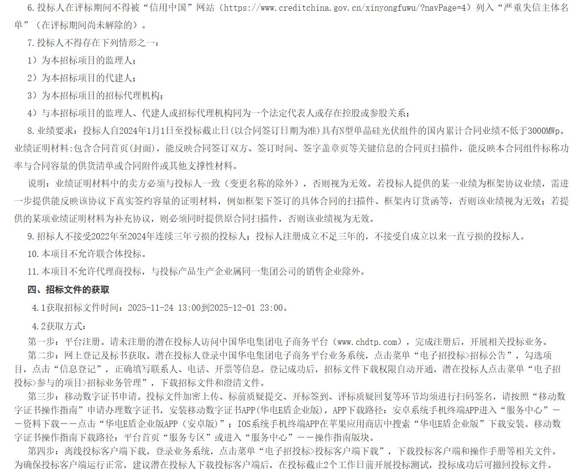 10月31日,云南华电2025年光伏组件集中采购招标公告发布,招标人为华电(云南)新能源发电有限公司。招标公告显示,此次集采范围为华电云南区域2个新能源项目所需的N型高效BC单晶硅双面双玻组件,其功率不小于650W。此次招标项目工期预计为合同生效后15日内具备供货条件,原则上华电泸水佑雅3万千瓦光伏项目2026年3月底前、华电南华陆家垭口二期15万光伏项目2026年5月底前完成全部组件供货。