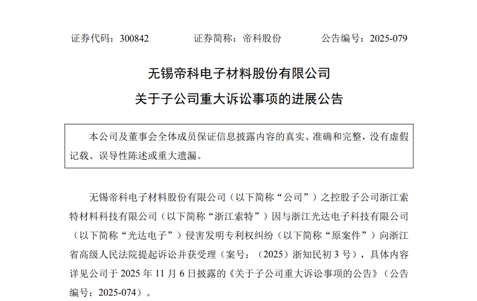 11月23日,无锡帝科电子材料股份有限公司(300842.SZ,下称“帝科股份”)公告显示,其控股子公司浙江索特材料科技有限公司(下称“浙江索特”)被浙江光达电子科技有限公司(下称“光达电子”)以“恶意提起知识产权诉讼损害责任”为由反诉,索赔500万元并要求公开赔礼道歉。