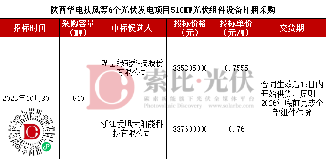 11月26日,陕西华电扶风等6个光伏发电项目510MW光伏组件设备打捆采购中标候选人公示,招标人为陕西华电新能源发电有限公司,招标容量510MW,分别用于陕西华电扶风县120MW光伏发电项目、陕西华电咸阳泾阳嵯峨山10万千瓦矿山治理光伏项目、陕西华电临渭区100MW光伏发电项目、陕西华电太平镇15万千瓦农光互补光伏发电项目、陕西华电安康高新源网荷储一期项目及华电蒲城县2万千瓦分布式光伏项目。