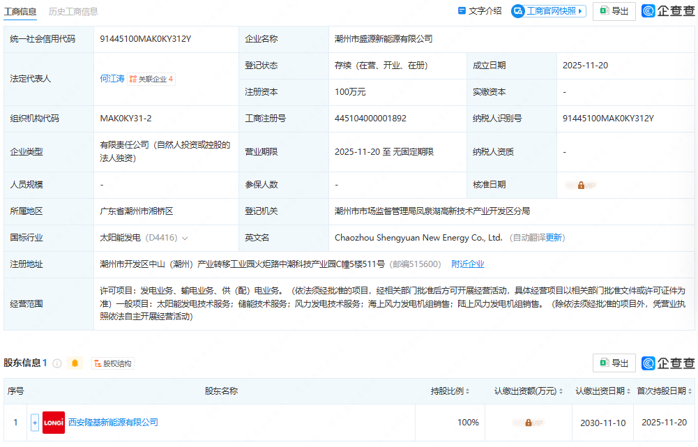 近日,潮州市盛源新能源有限公司成立,经营范围包含:太阳能发电技术服务;储能技术服务;风力发电技术服务;海上风力发电机组销售等。股权数据显示,该公司由隆基绿能间接全资持股。
