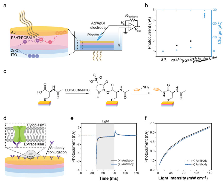图1. 抗体修饰与器件性能。(a) 光伏器件结构及光电流测试的示意图;(b) 不同结构器件的性能表现;A.L.:P3HT:PCBM;(c) 抗体在ITO/ZnO/P3HT:PCBM/Au表面的生物偶联过程;(d) 抗体修饰生物界面的示意图;(e) 在138.4 mW cm−2光照下,表面具有抗体修饰与未修饰的器件光电流波形对比;(f) 不同光照强度下表面进行抗体修饰与未修饰的器件光电流响应。