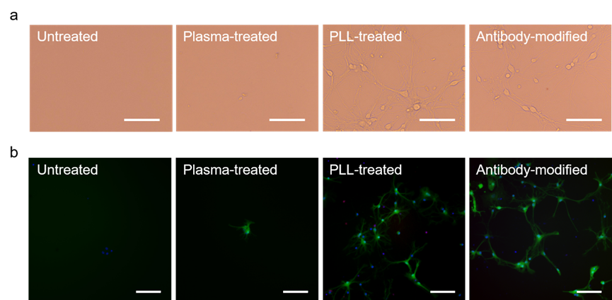 图2. 不同表面处理后生物界面上的细胞活性。(a)在ITO/ZnO/P3HT:PCBM/Au上对表面不处理、氧等离子体处理、PLL处理及抗体修饰后,培养14天的原代海马神经元;(b) 细胞活性荧光染色结果,显示培养14天的细胞存活状态。